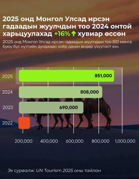 2025 онд Монгол Улсад ирсэн гадаадын жуулчдын тоо 851 мянга буюу 2024 онтой харьцуулахад 16 хувиар өссөн нь бүс нутгийн дунджаас хоёр дахин өндөр үзүүлэлт байна.