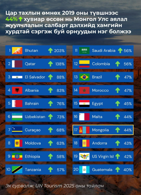 “UN Tourism”-оос сар бүр эрхлэн гаргадаг олон улсын “World Tourism Barometer” тайлангийн 2025 оны үр дүнгээр Монгол Улс аялал жуулчлалын сэргэлтийн үзүүлэлтээр дэлхийн шилдэг 20 улсын тоонд багтсан талаар Улсын Их хурлын гишүүн, ССАЖЗ-ын сайд асан Ч.Номин өөрийн цахим хуудсаараа дамжуулан мэдээллээ.