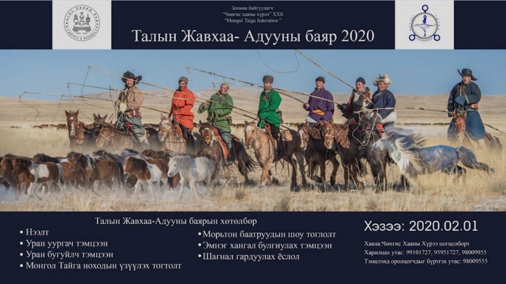 Эртний нүүдэлчдийн өв уламжлал болсон биет бус соёлын өвийг хадгалан авч үлдэх, Морьтон Монголын малчин ахуй, адуу дагасан соёлыг сурталчилан таниулж, адуучдын авьяас чадварыг алдаршуулах зорилгоор “Талын жавхаа-2020” буюу адууны соёлын өдөрлөг ирэх хоёрдугаар сарын 1-нд болно.
