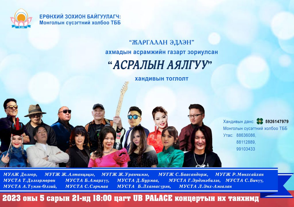 “Монголын Сүсэгтний Холбоо ТББ”-аас зохион байгуулж буй “ЖАРГАЛАН ЭДЛЭН” ахмадын асрамжийн газарт зориулсан “АСРАЛЫН АЯЛГУУ” хандивын тоглолт 2023.05.21-нд UB palace-т болно.