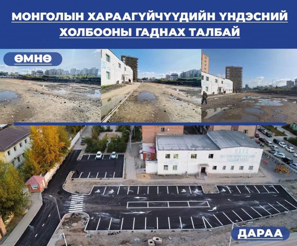 Өнгөрсөн тавдугаар сард Нийслэлийн Засаг даргын Нийгмийн салбар, ногоон хөгжил болон агаар, орчны бохирдлын асуудал хариуцсан орлогч З.Төмөртөмөө, Нийгмийн бодлогын хэлтсийн дарга Б.Мөнгөншагай нар холбогдох албаныхны хамт Монголын хараагүйчүүдийн үндэсний холбоо /МХҮХ/-ны гишүүдтэй “Асуудал шийдэл” хэмээх хэлэлцүүлгийг хийсэн билээ. Уг хэлэлцүүлгийн шийдэлд зам талбайн тохижилт, засвар хийх, нийтийн тээврийн үйлчилгээ үзүүлэхдээ хөгжлийн бэрхшээлтэй иргэдийн хэрэгцээ, шаардлагыг харгалзан, тэдэнд ээлтэй орчин бүрдүүлэхэд анхаарч ажиллахаа  З.Төмөртөмөө мэдэгдсэн. Тэгвэл МХҮХ-ны гадна тохижилтын ажлыг хийж гүйцэтгэж байгаа эерэг мэдээг дуулгая. Зам талбайн тохижилтын ажил бүрэн дуусжээ. Одоо ногоон байгууламжийн тохижилтын ажил хийгдэж байна.