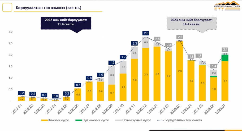Өнгөрсөн 2022 онд 11.5 сая тонн нүүрс экспортолж, 1,1 тэрбум ам.долларын борлуулалттай ажилласан. Тэгвэл 2023 оны 07 сарын 31-ний өдрийн байдлаар 14.4 сая тонн нүүрс экспортолж, 1,4 тэрбум ам.долларын борлуулалт хийн, 2022 оны бүтэн жилийн борлуулалтыг 125 хувиар, орлогыг 131 хувиар давуулан биелүүллээ.
