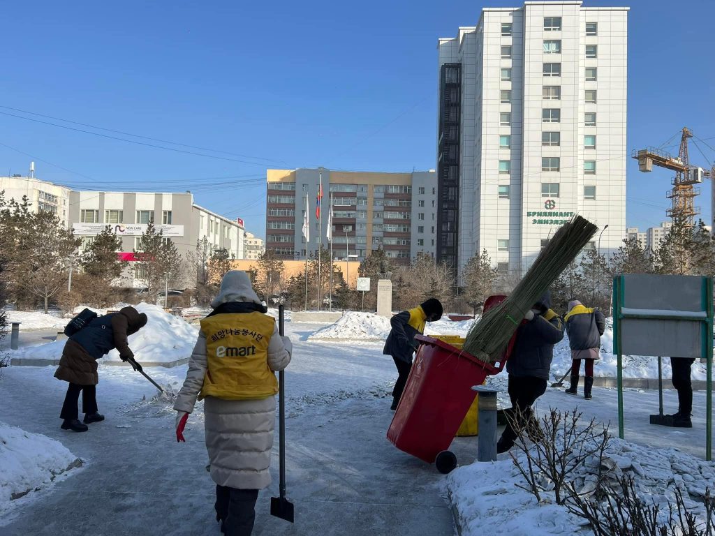 Шинэ оны анхны сайн үйлсийн аяныг олны хөл хөдөлгөөн ихтэй ‘‘Улсын Хоёрдугаар төв эмнэлэг’’, ‘‘Гэмтэл согог судлалын үндэсний төв’’, ‘‘Хавдар судлалын үндэсний төв’’ болон ‘‘Улсын Гуравдугаар төв эмнэлэг’’-үүдийн нийт 1800 м2 талбай бүхий явган хүний замын дагтаршсан цас мөсийг цэвэрлэж эхлүүлжээ.