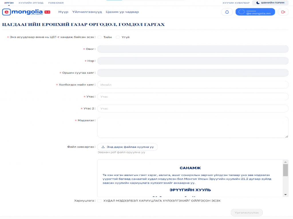 “ТӨРИЙН ЦАХИМ ҮЙЛЧИЛГЭЭНИЙ Е-МОНГОЛИА” СИСТЕМЭЭР ГОМДОЛ, МЭДЭЭЛЭЛ ГАРГАХ