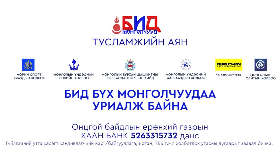 Тус аяны хандивыг Онцгой Байдлын Ерөнхий газрын хаан банкны данс 5263315732 руу сэтгэлийн хандиваа өргөхийг уриалж байна.