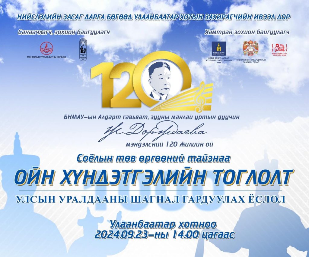 Нийслэлийн Засаг дарга бөгөөд Улаанбаатар хотын Захирагчийн ивээл дор, Монгол уртын дууны сонгодог уламжлалыг хойч үед өвлүүлэх гавьяат үйлийг бүтээж, шинэ цагийн соёл, урлагийн хөгжлийн түүхэнд тод мөрөө үлдээсэн, БНМАУ-ын алдарт гавьяат, зууны манлай эрэгтэй уртын дуучин Ж.Дорждагвийн мэндэлсний 120 жилийн ойг тэмдэглэнэ.