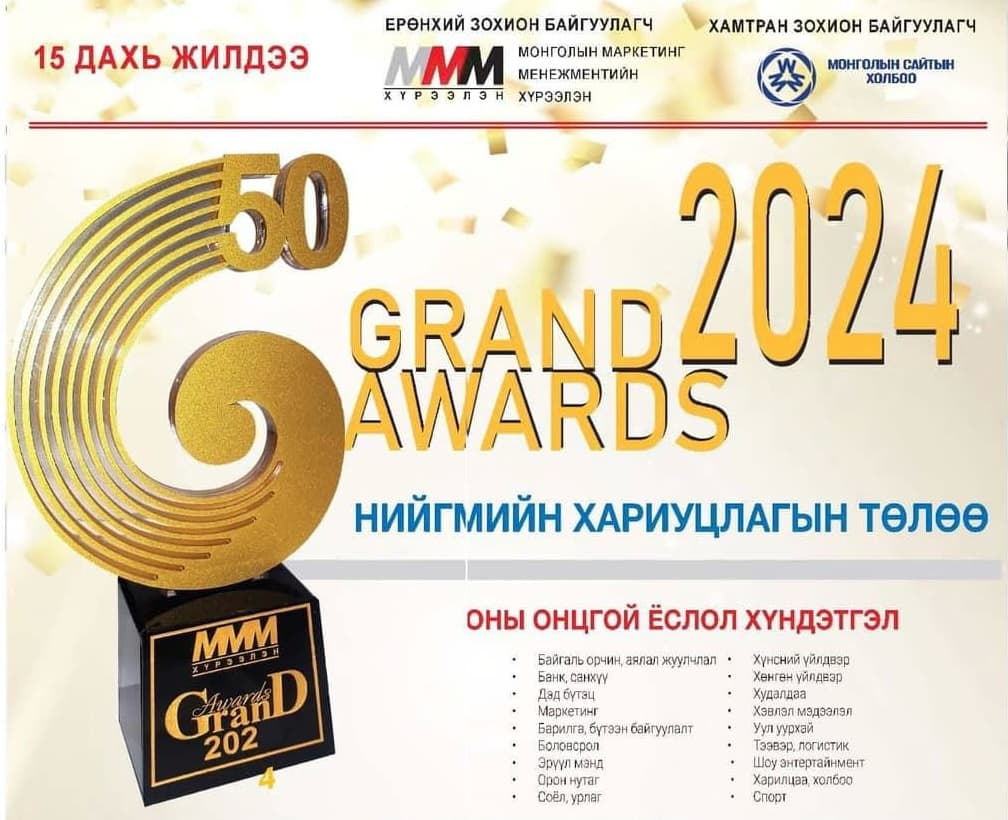 Монголын маркетингийн менежментийн хүрээлэн, Монголын сайтуудын холбооноос 15 дахь удаагаа зохион байгуулагдаж байгаа Grand awards 2024  наадмын энэ жилийн уриа “Нийгмийн хариуцлагын төлөө” юм байна.