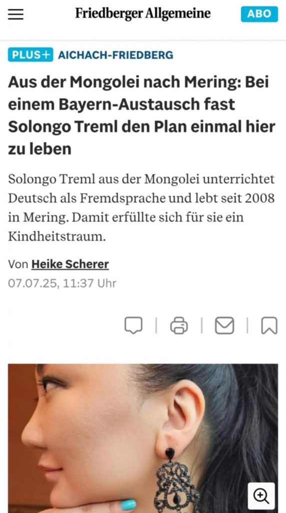 Германы Friedberger Allgemeine сонинд гадаад улсаас тус улсад нутагшин амьдарч буй иргэдийн талаарх нийтлэл гаргадаг бөгөөд энэ удаад Н.Солонго Тремлийн талаар гарсан нийтлэлийг уншигч та бүхэнд орчуулан хүргэж байна.
