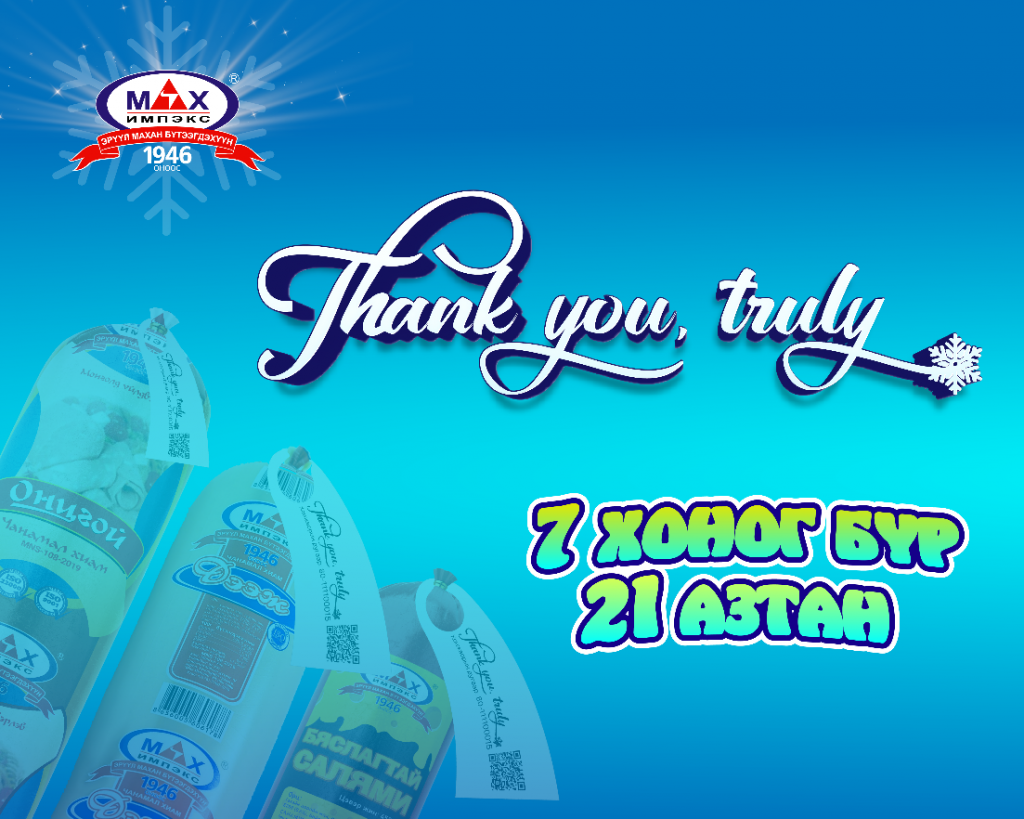 Түүхт 80 жилийн ойгоо угтаж буй “Мах Импэкс” ХК нь шинэ оны босгонд бүхий л цаг үед хамт байсаар ирсэн нийт хэрэглэгч, харилцагч, үе үеийн түүхийг бүтээлцсэн ажилчид болон малчин түмэндээ “Thank you, truly” буюу “Чин сэтгэлээсээ бүх зүйлд баярлалаа” хэмээх талархлын кампанит ажил эхлүүллээ. Энэхүү кампанит ажлын хүрээнд 8 настай балчраас 80 настай буурай хүртэлх бүхий л хэрэглэгчдэдээ талархал илэрхийлэхээр олон сонирхолтой урамшуулал, бэлгүүдийг бэлдээд буй юм.
