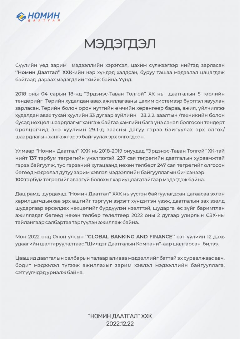 “Тавантолгой түлш” ХХК өөрсдийн үйл ажиллагааг тагнуулын байгууллагаар шалгуулахаар болсноо мэдэгдлээ