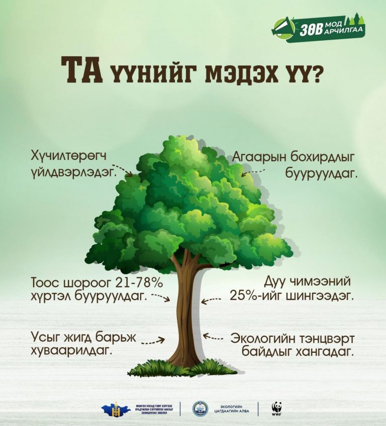 Дэлхий дээр 100,000 зүйлийн мод сөөг байдаг бол манай улс 140 гаруй зүйлийн модлог ургамалтай. Мод бол дэлхийн дулаарлыг сааруулагч…