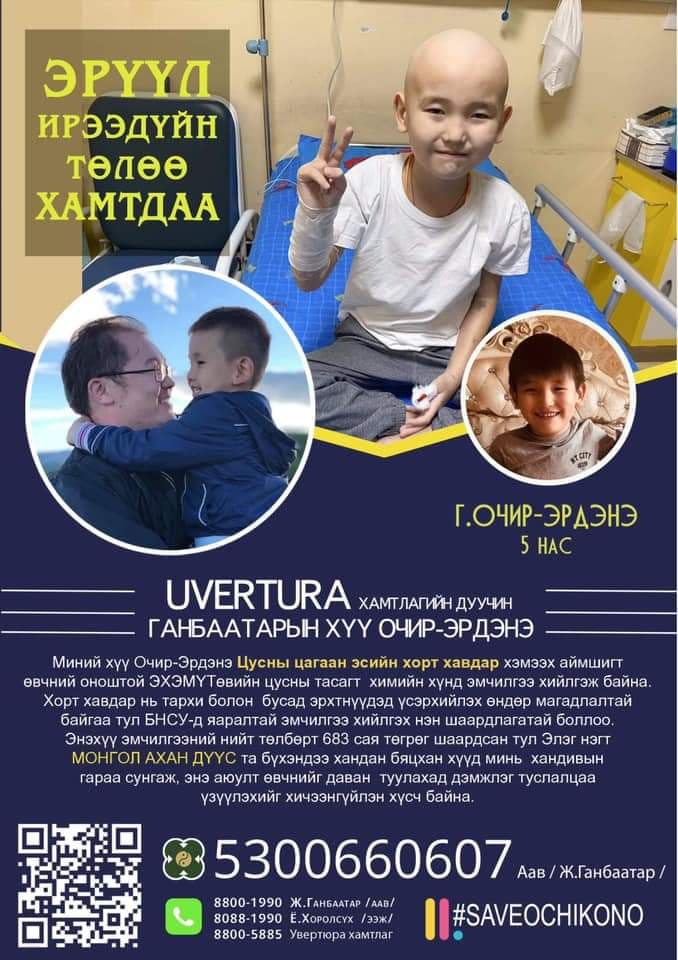Увертюра хамтлагийн гишүүн Ганбаатар найзын минь хүү 5 настай Г.Очир-Эрдэнэ цусны цагаан эсийн хорт хавдраар өвчилж, химийн тарианд өвдөж, найз…