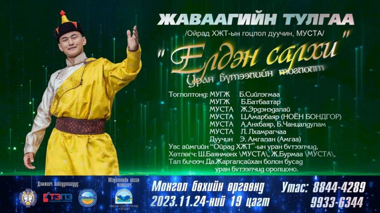 Увс аймгийн Ойрад хөгжимт жүжгийн театрын гоцлол дуучин Жаваагийн Тулгаа “ЕЛДЭН САЛХИ” уран бүтээлийн тоглолтоо арваннэгдүгээр сарын 24-нд 19:00 цагаас…